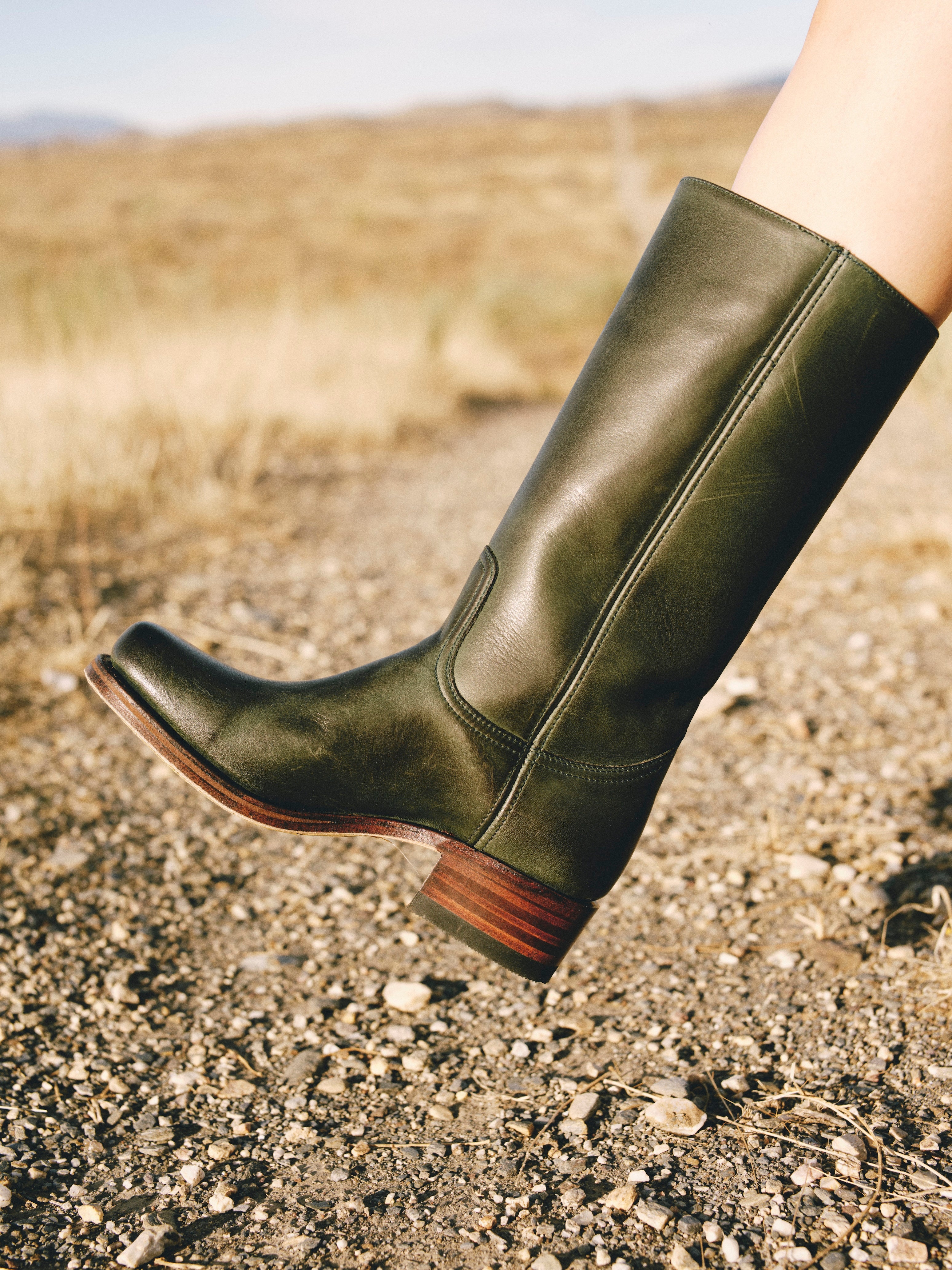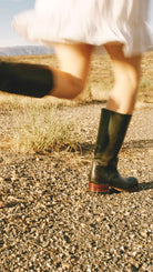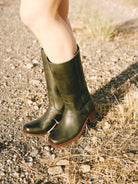 Diep groen geeft rustige kleur aan klassieke chunky leren laarzen. Net genoeg spanning zonder je look te overheersen. De lage hak houdt je pas stevig en ontspannen. De schacht sluit comfortabel aan om je been. Dit is het paar dat elke outfit optilt.