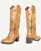 Deep golden stars and cactuses brighten a brown Western profile with confident flair. Crafted in Spain from premium leather and secured with a Goodyear welt for added durability, you can feel confident. Deadstock, and there is only one pair of each size
