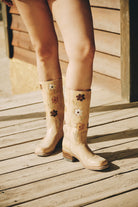 Deze camel bloemenlaarzen zijn handgemaakt in Spanje. Het is gemaakt van het fijnste rundleer. Na verloop van tijd passen deze bloemenlaarzen zich aan en vormen ze zich om perfect aan je voeten te passen. De laarzen vallen op maat en passen bij elke stijl. Of je nu een vintage 70s babe, bohemian soul, western cowgirl of gewoon ... bent, het zal een investeringsstuk zijn dat elke outfit opfleurt.