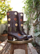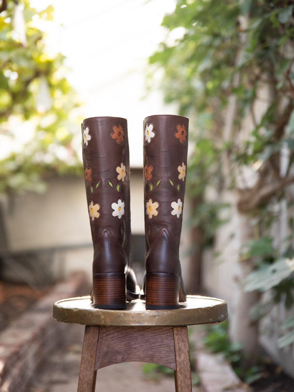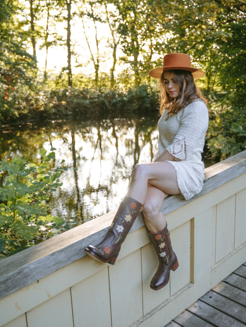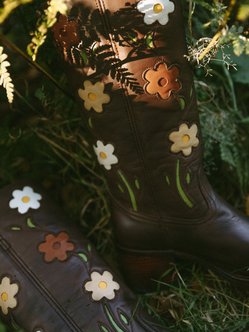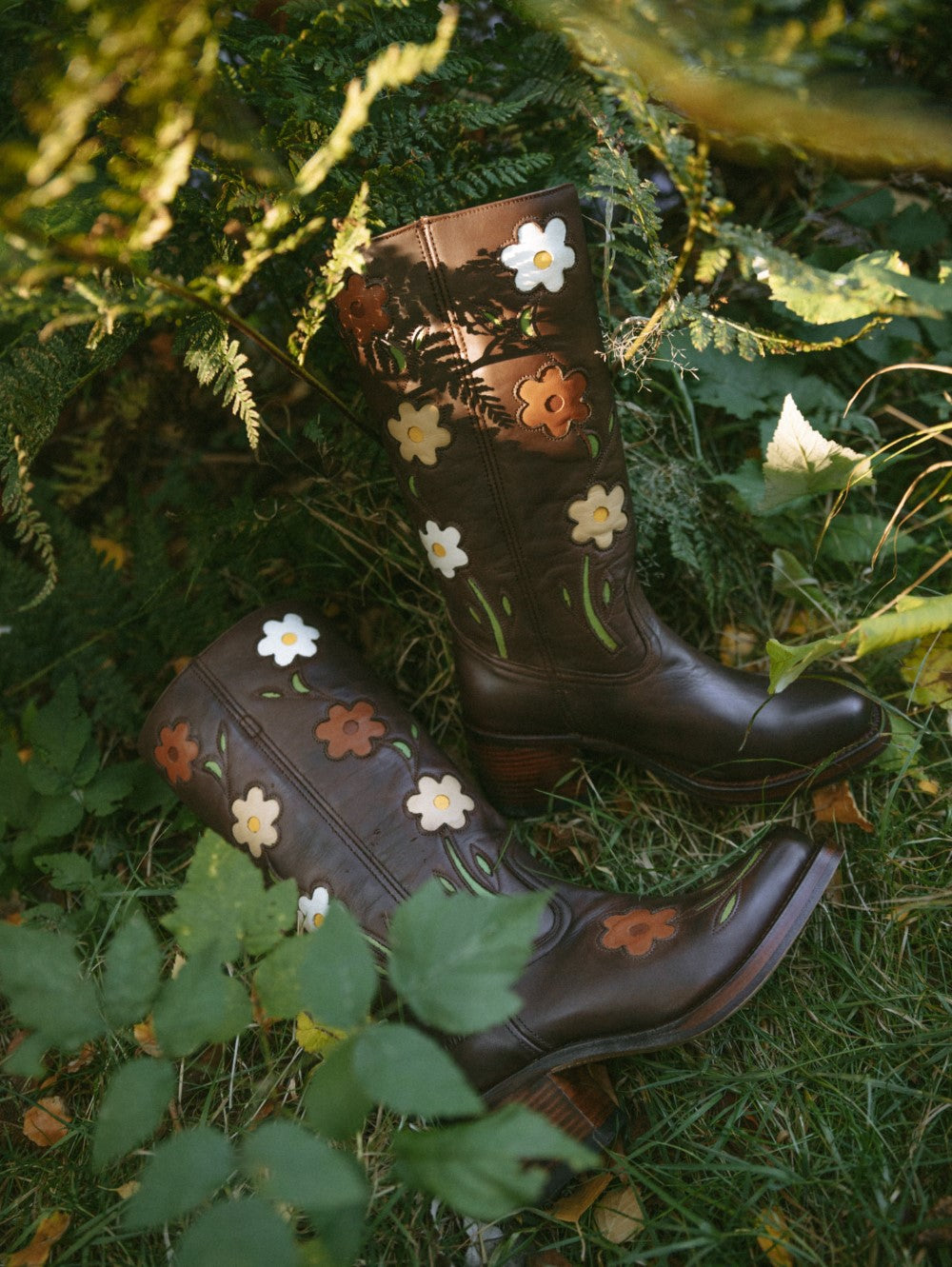 Deze bloemen laarzen in donkerbruin worden handgemaakt in Spanje. Onze laarzen zijn gemaakt van het fijnste leer en zullen zich na verloop van tijd aanpassen en vormen om perfect aan je voeten te passen. Onze laarzen passen bij elke stijl, of je nu een vintage babe uit de jaren 70 bent, een Bohemian soul, een western cowgirl of gewoon je stijl wilt opfleuren! Deze laarzen zijn een statement, investeringsstuk dat elke outfit naar een hoger niveau zal tillen.