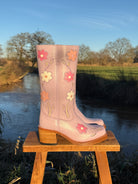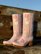 Crafted from premium leather, these Lilac Flower Boots with a soft pastel base are beautifully decorated with inlaid pink and white flowers, complemented by raw silver metallic accents in the stems and leaves. The floral design is carefully inlaid to ensure durability while maintaining a handcrafted look. This blend of gentle lilac tones and detailed blooms creates a distinctive silhouette that complements both casual and more formal outfits with ease.