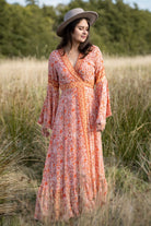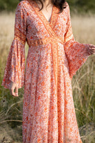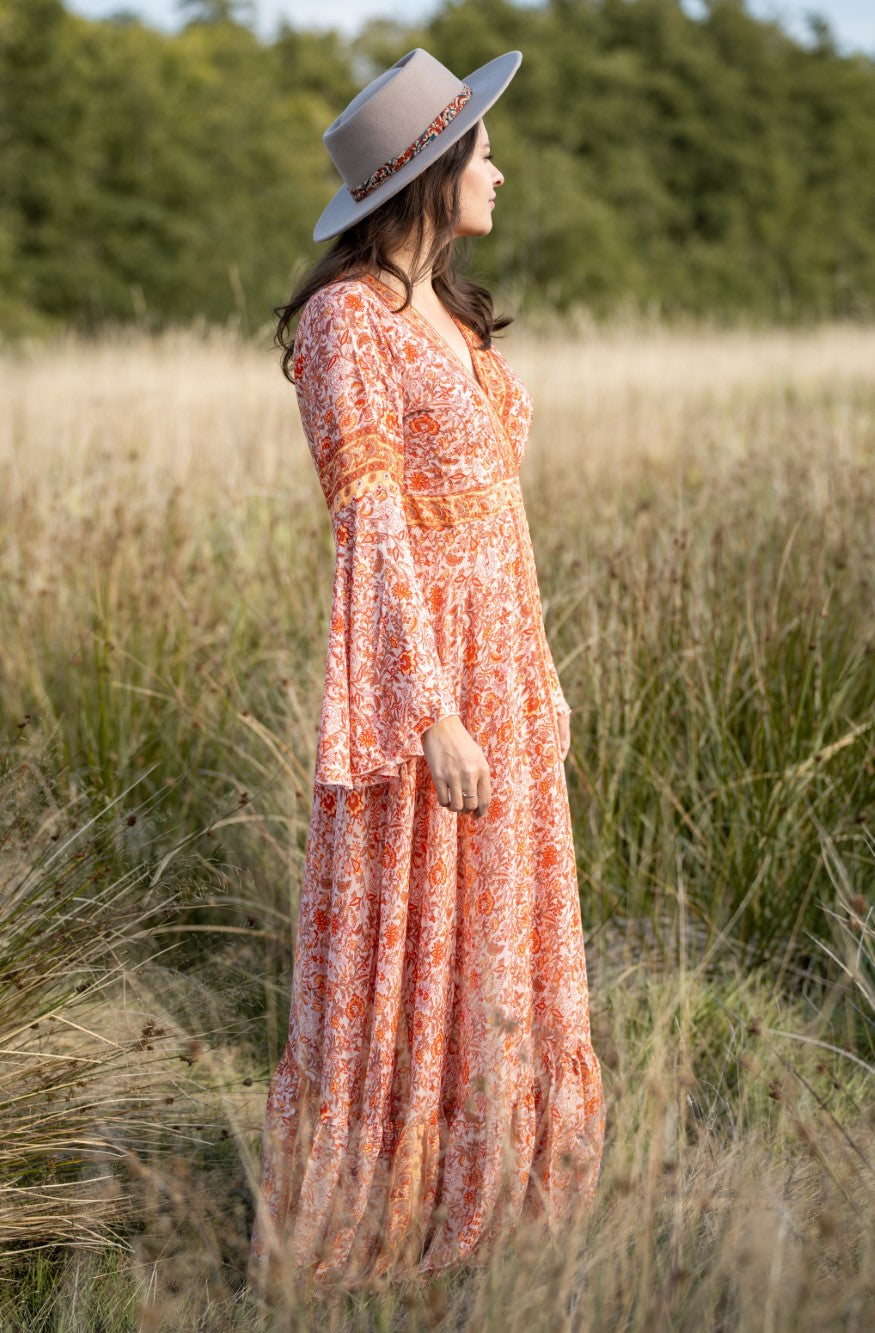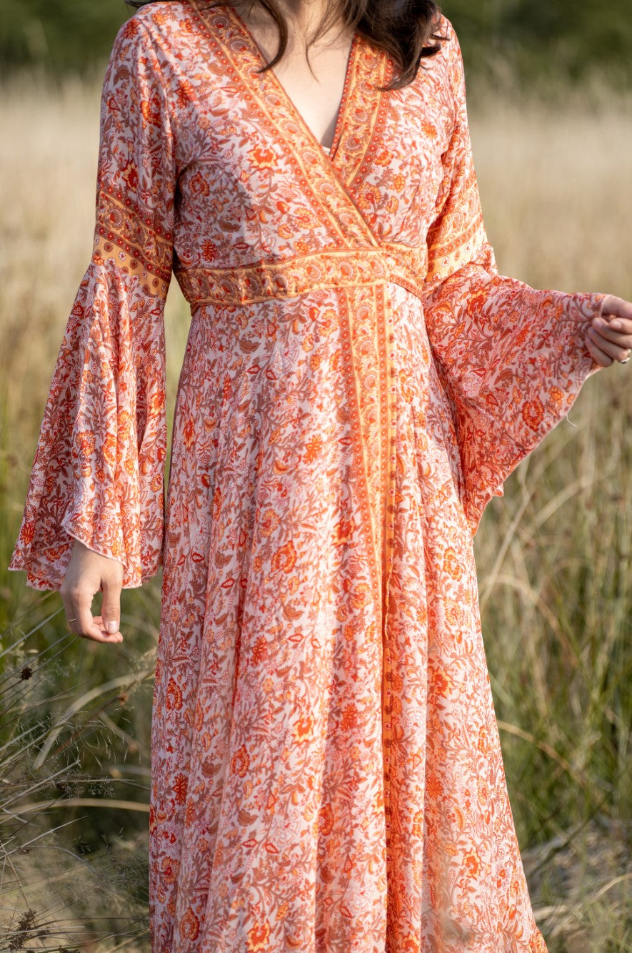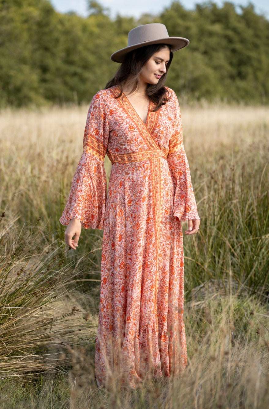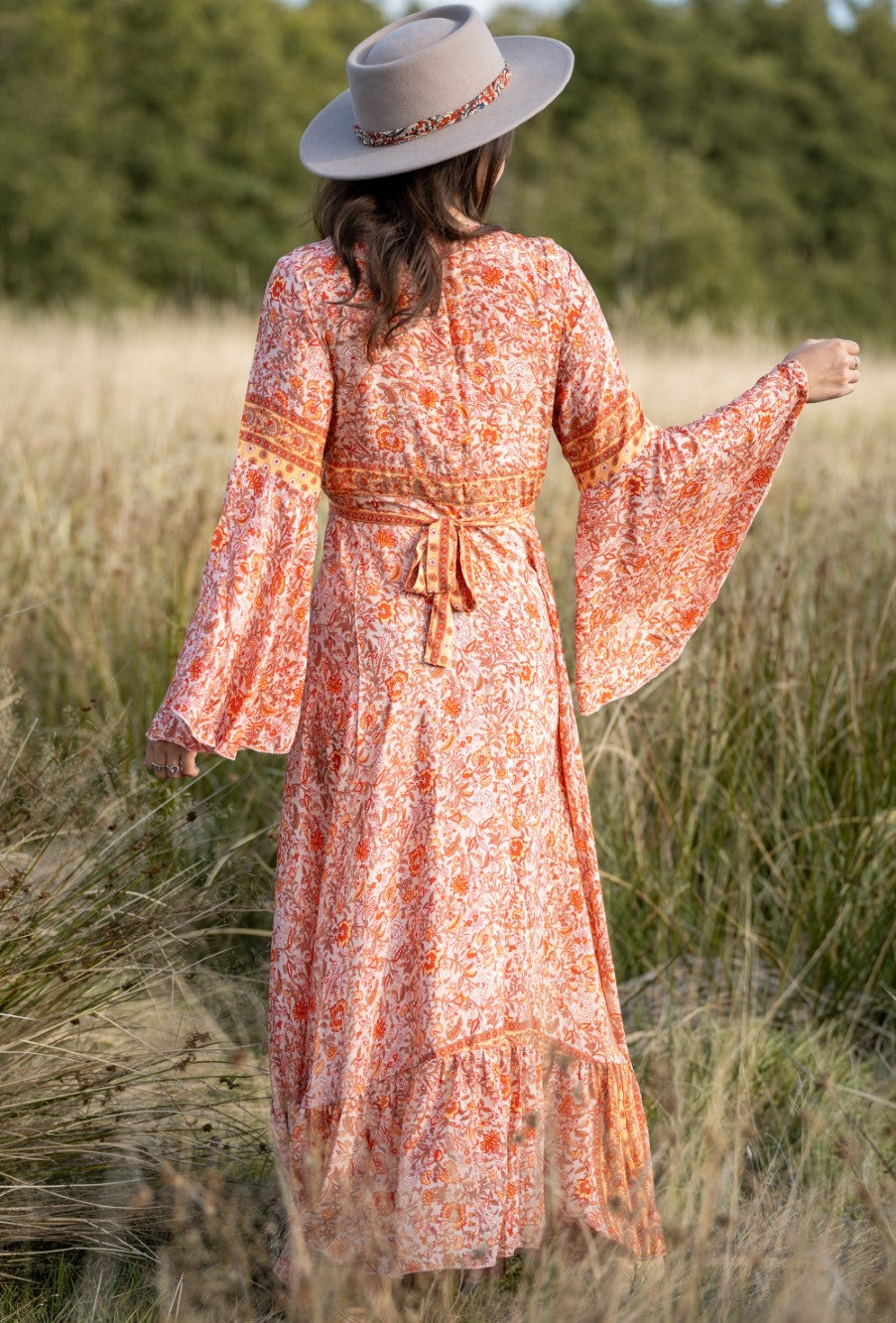 Jeanne is 173 cm en draagt ​​maat S/M. Deze kimono wikkeljurk is een onesize en draagbaar tot maat L/XL