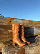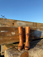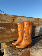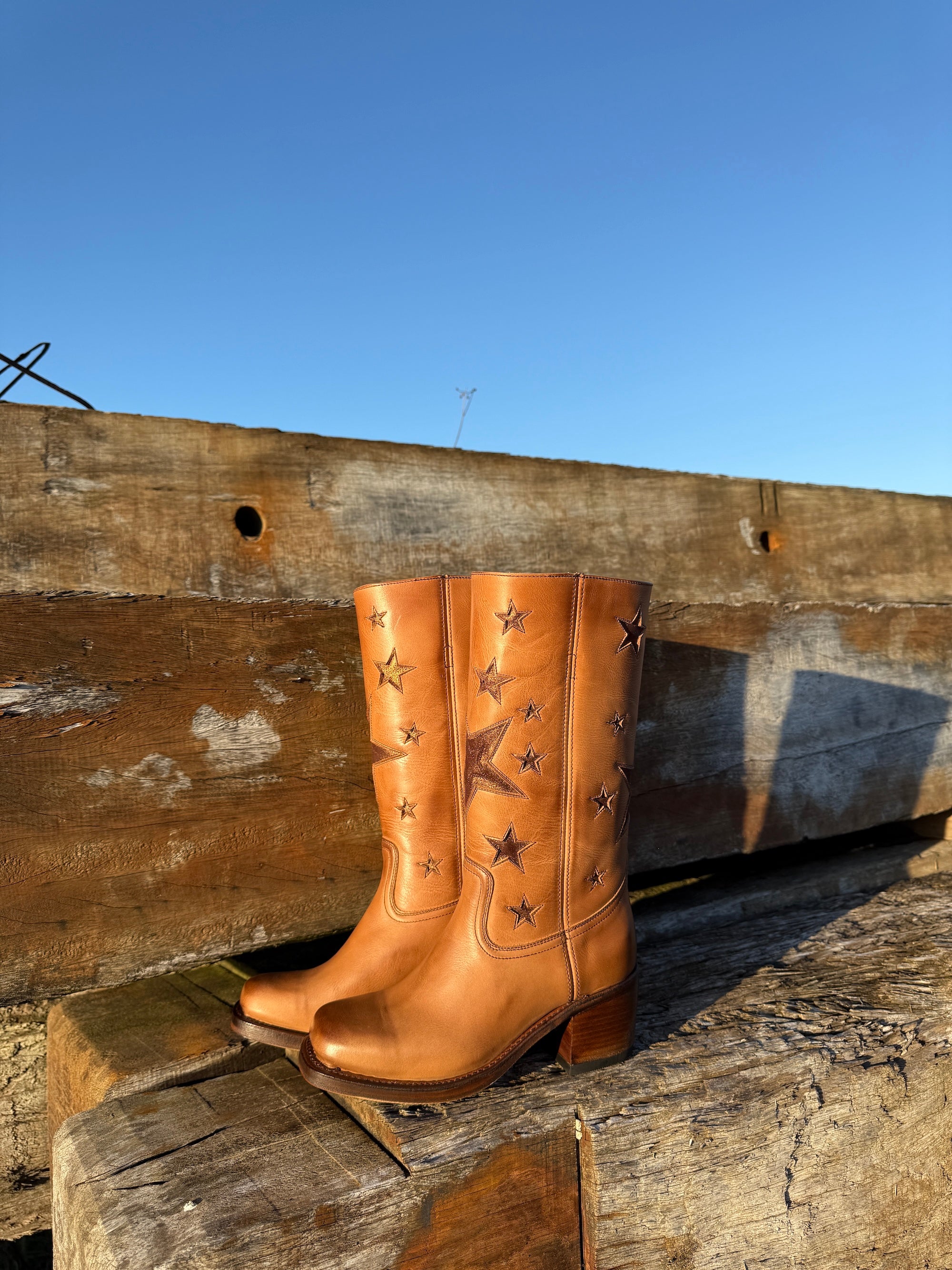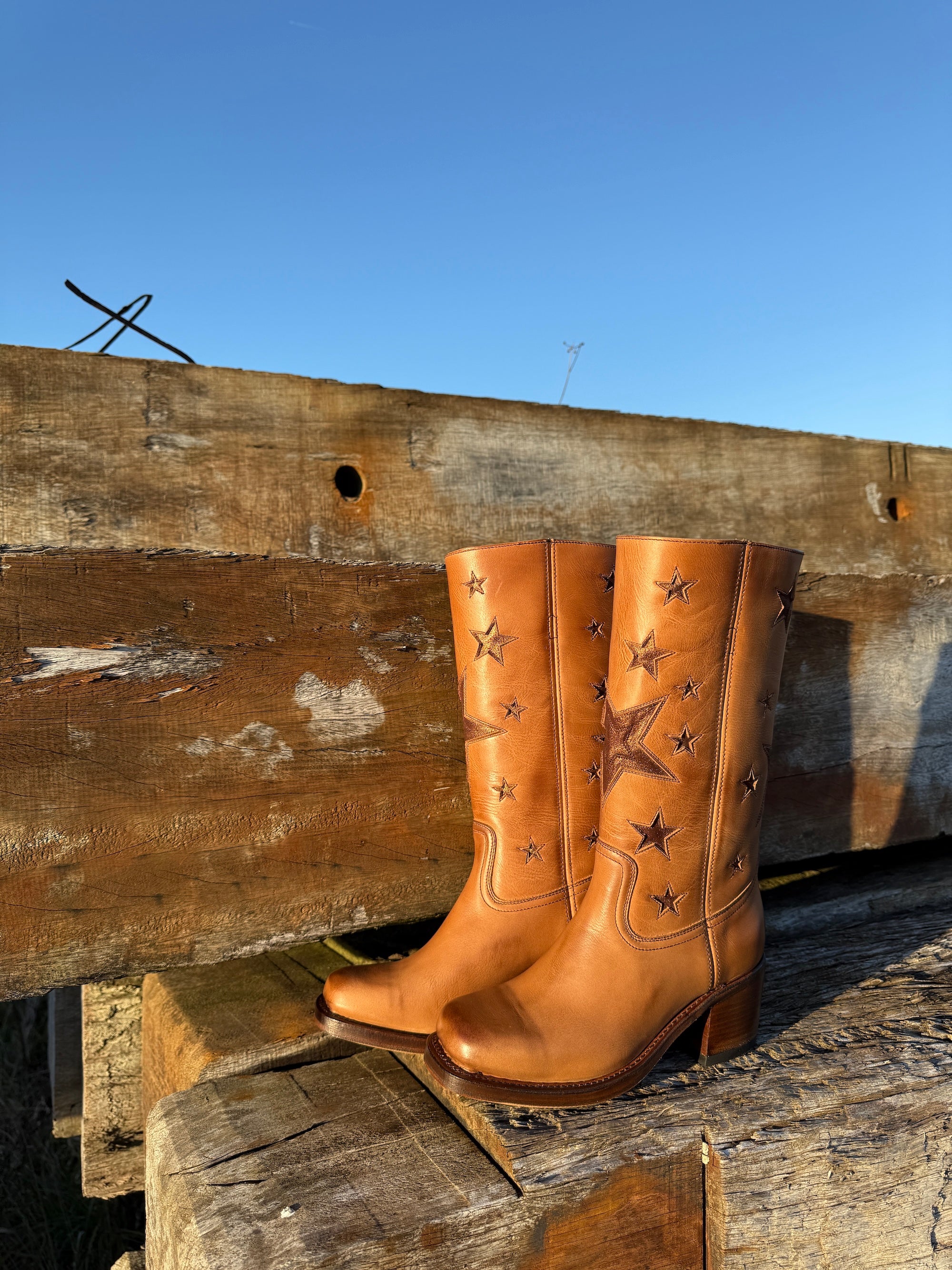 Tall and elegant in deep brown suede, this western boot is refined yet bold. Subtle gold metallic stars softly catch the light, creating a shimmering colour that complements both western outfits and more casual looks.