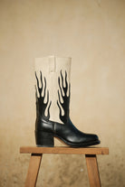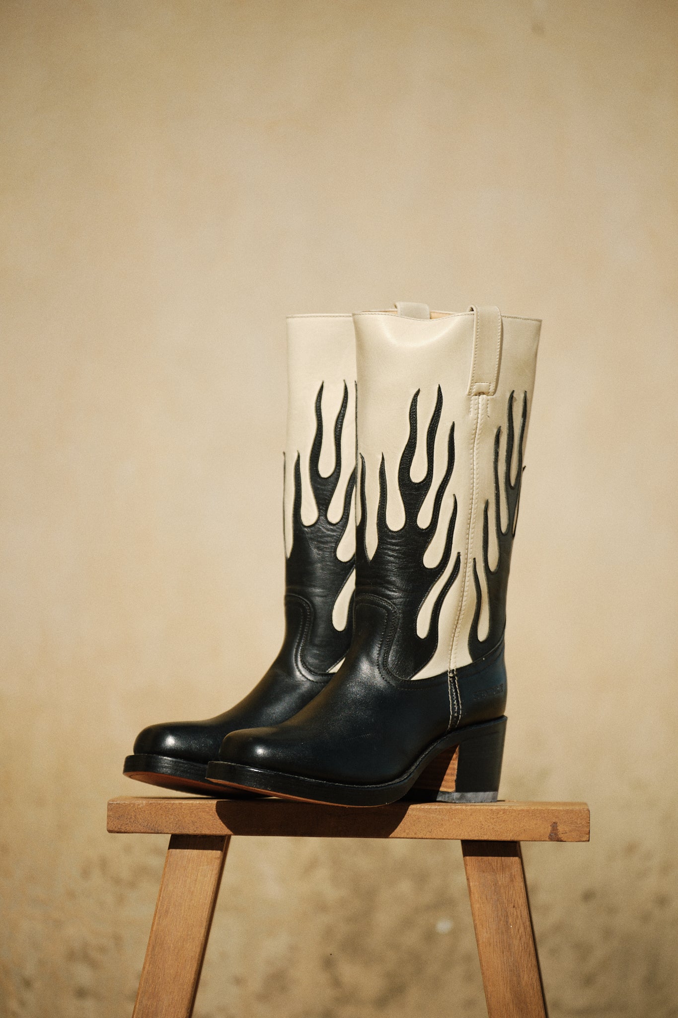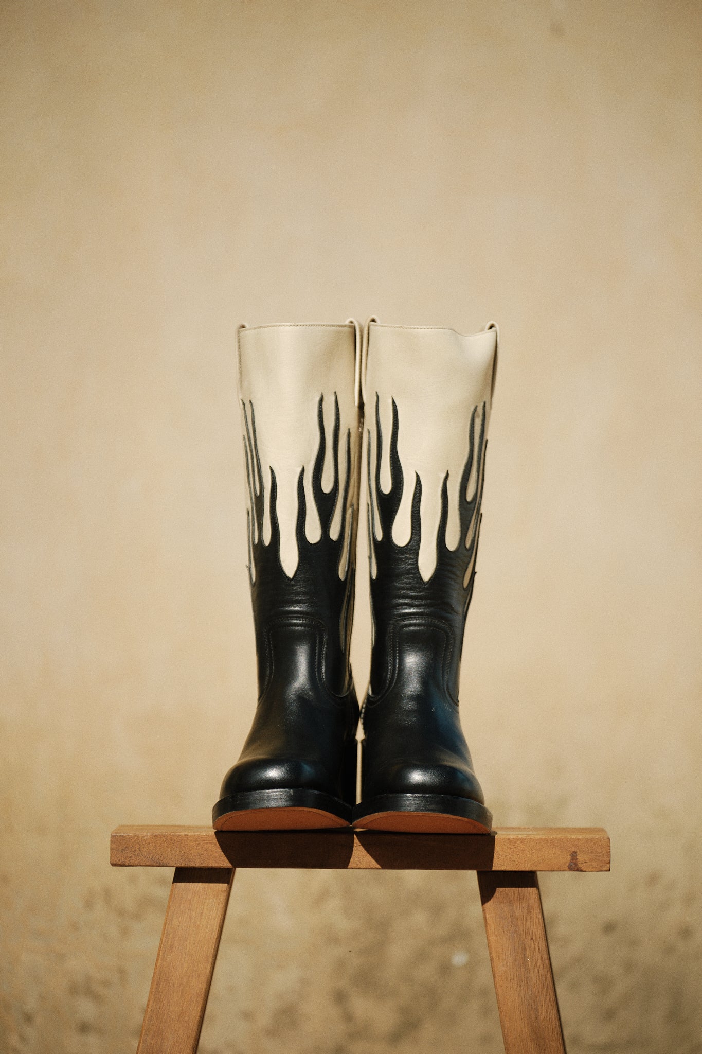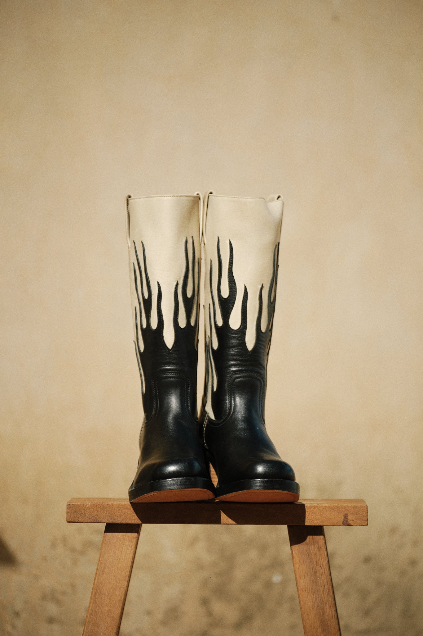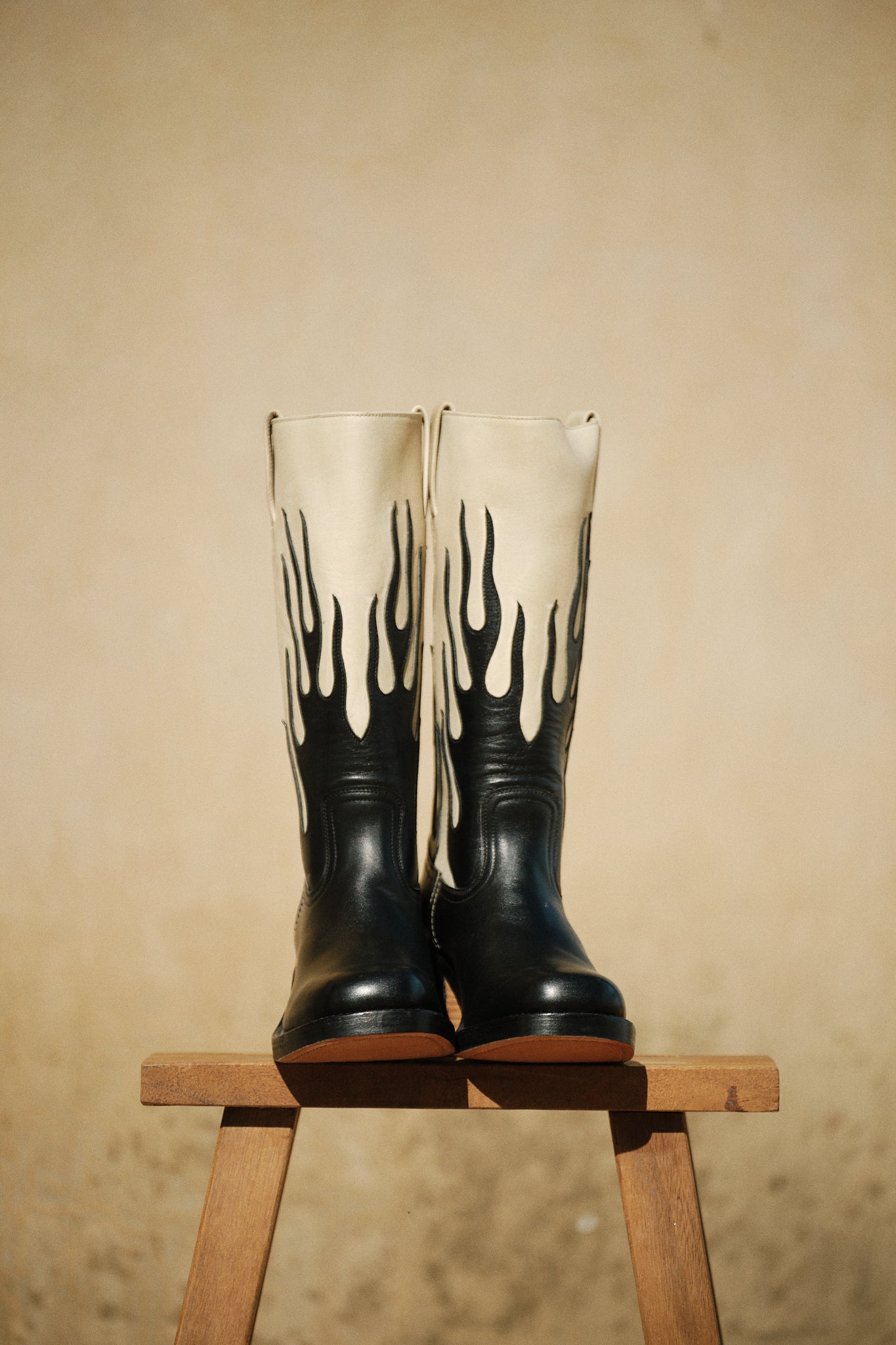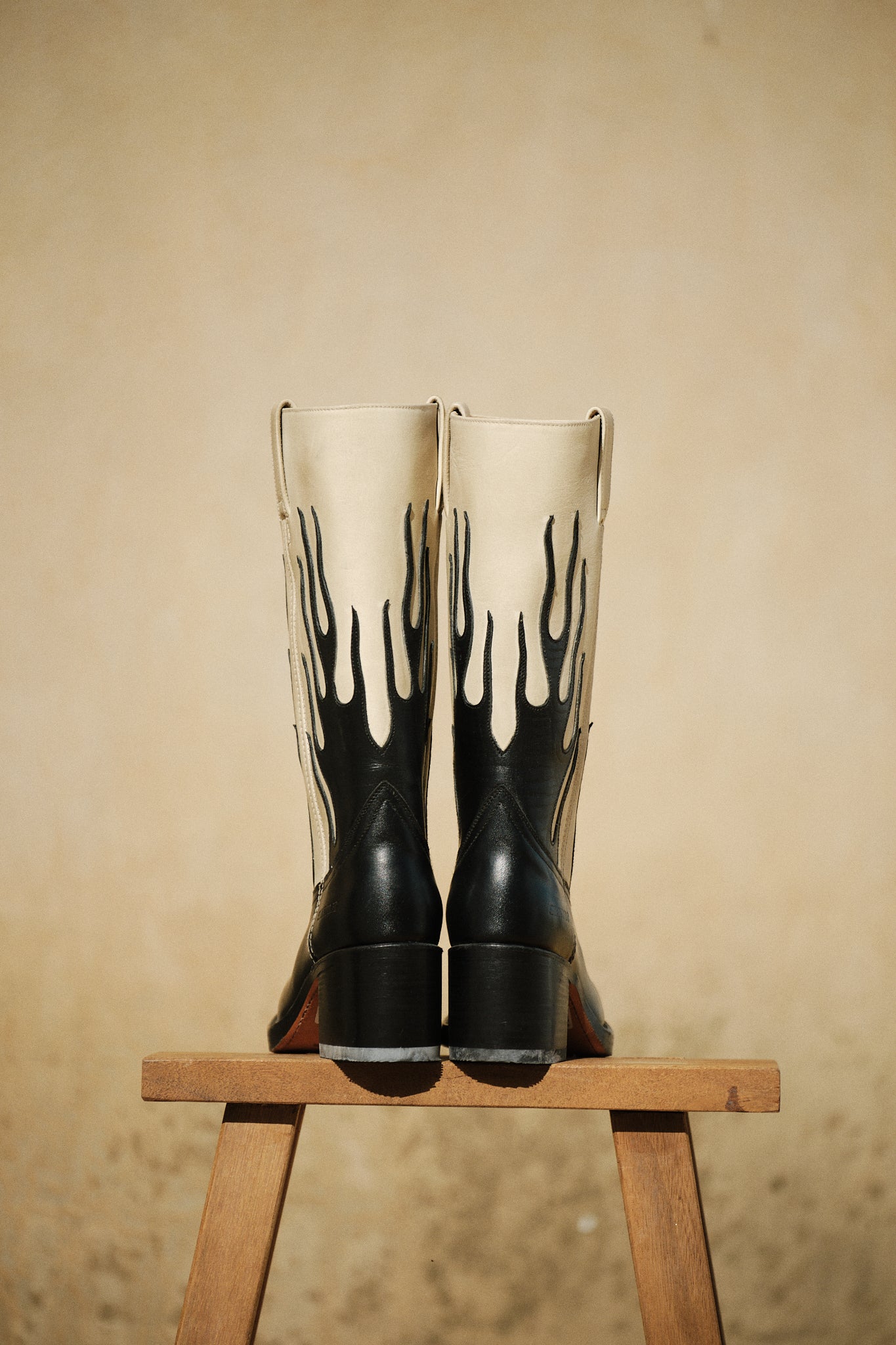 Black and white take on our Chunky Boots in Black Flame. Bold flame detail turns a classic profile into an eye-catcher. Handcrafted in Spain from high-quality leather that ages beautifully. Only one pair is available.