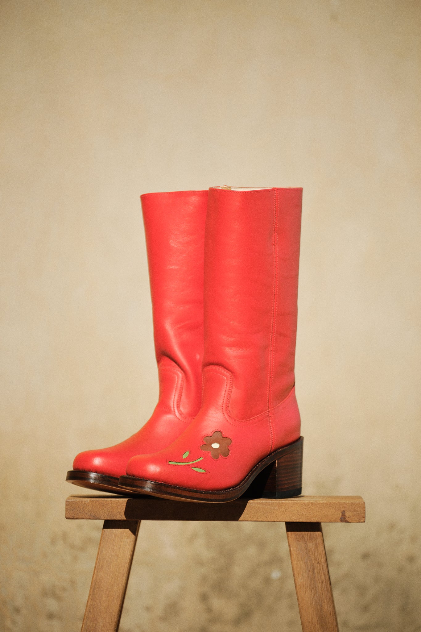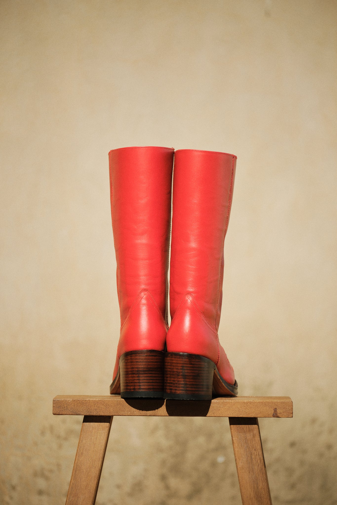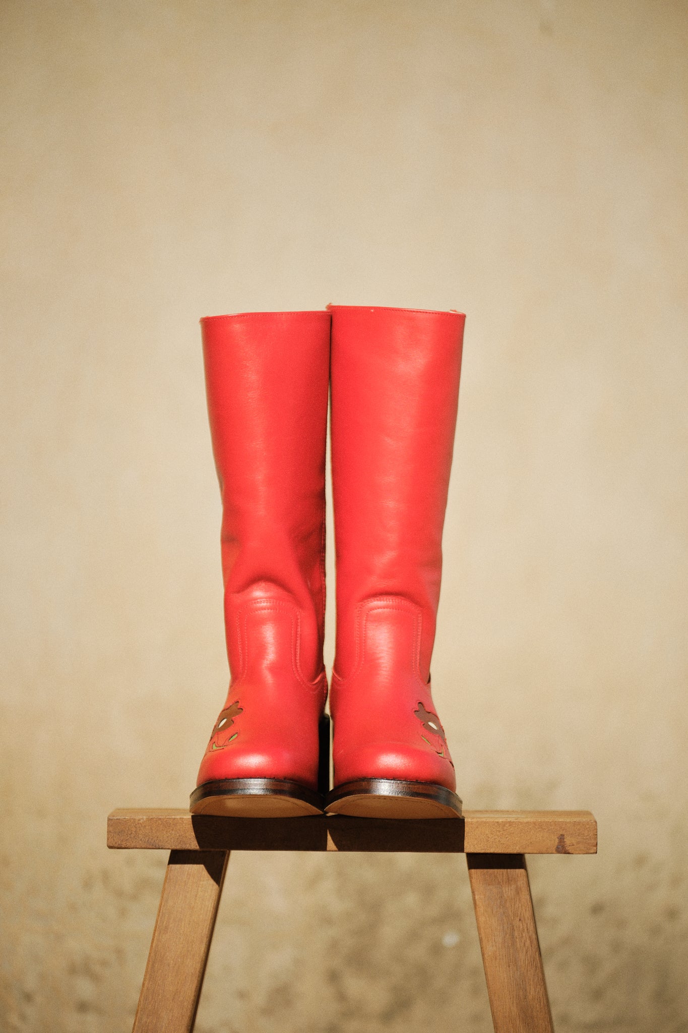 Crimson, bright leather, and floral detail create a standout boot that reads classic and bold. Made in Spain from high-quality leather with a Goodyear welt for lasting structure. Deadstock with one pair only.