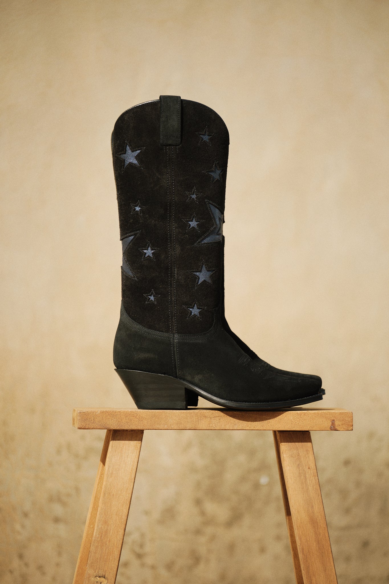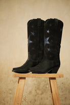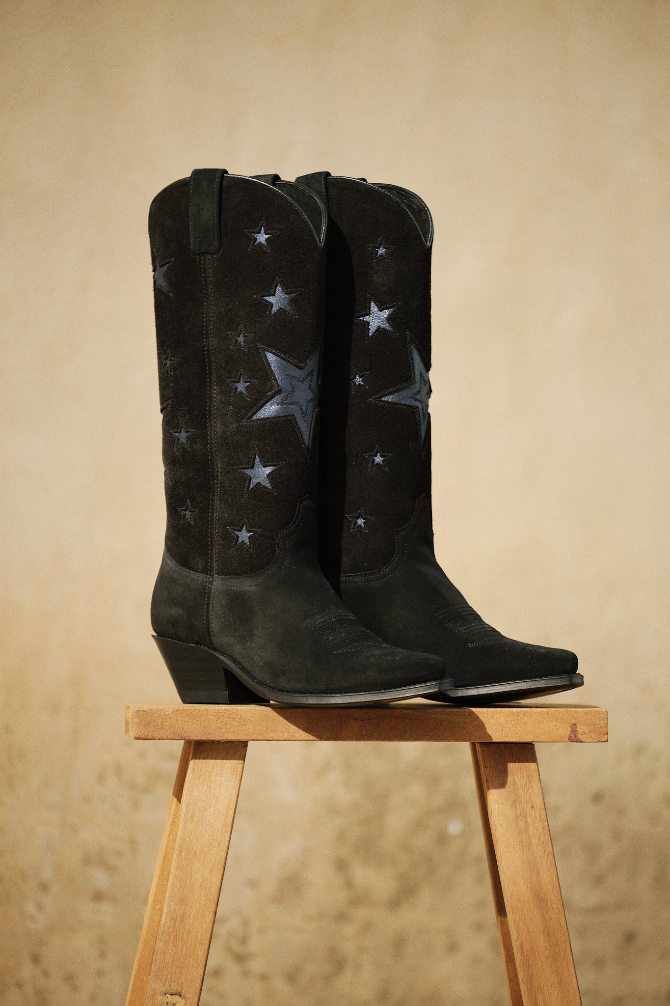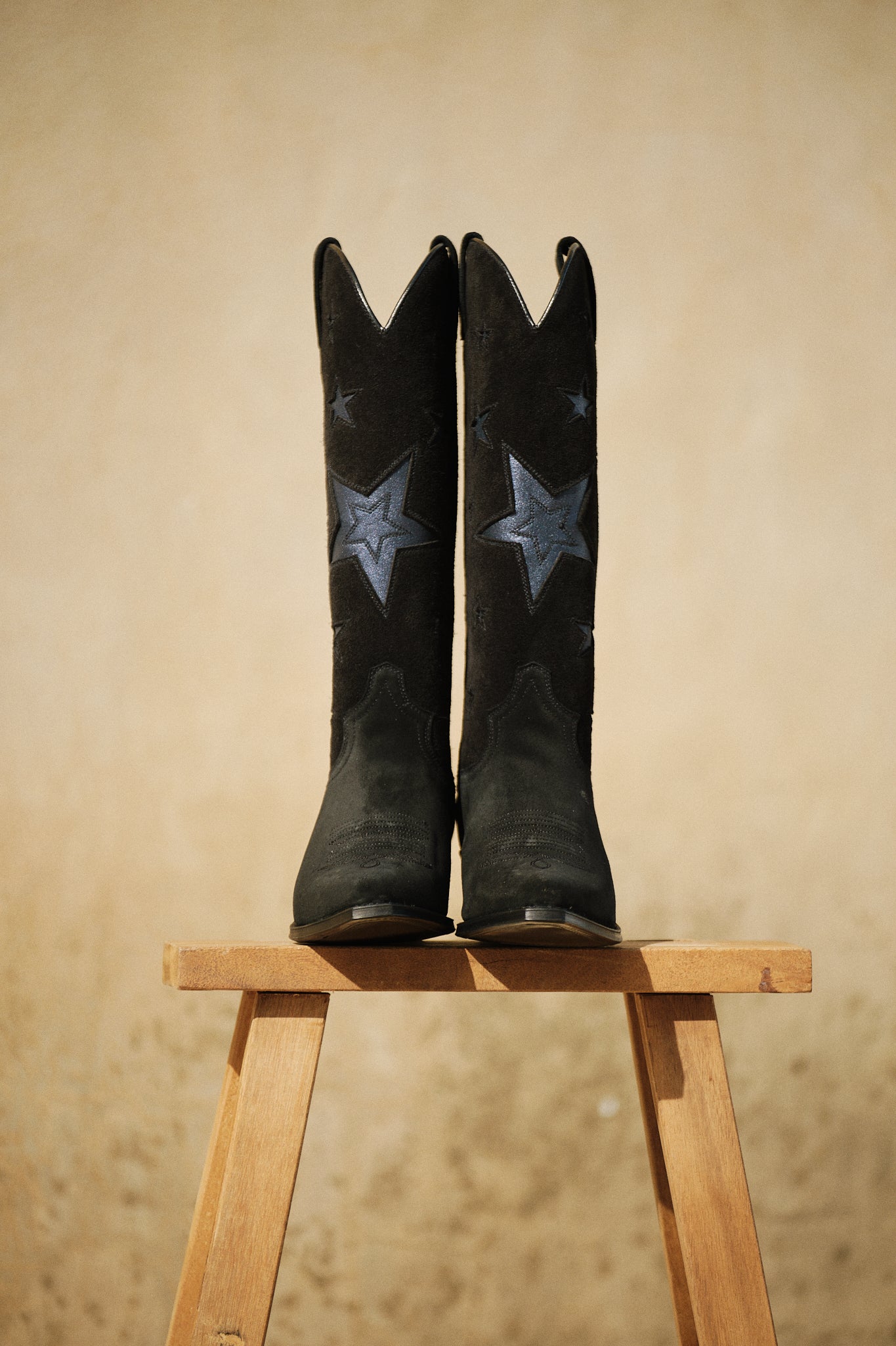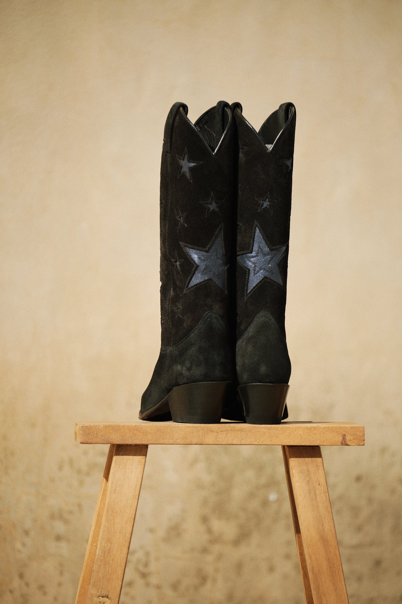 Schitter onder de sterren met een western laars die een klassiek silhouet verbindt met een vleugje night sky glamour. De subtiele sterrendetails geven een zachte glans en maken de look stoer en toch verfijnd. Je draagt ze moeiteloos bij denim, bij jurken en onder je favoriete jas.