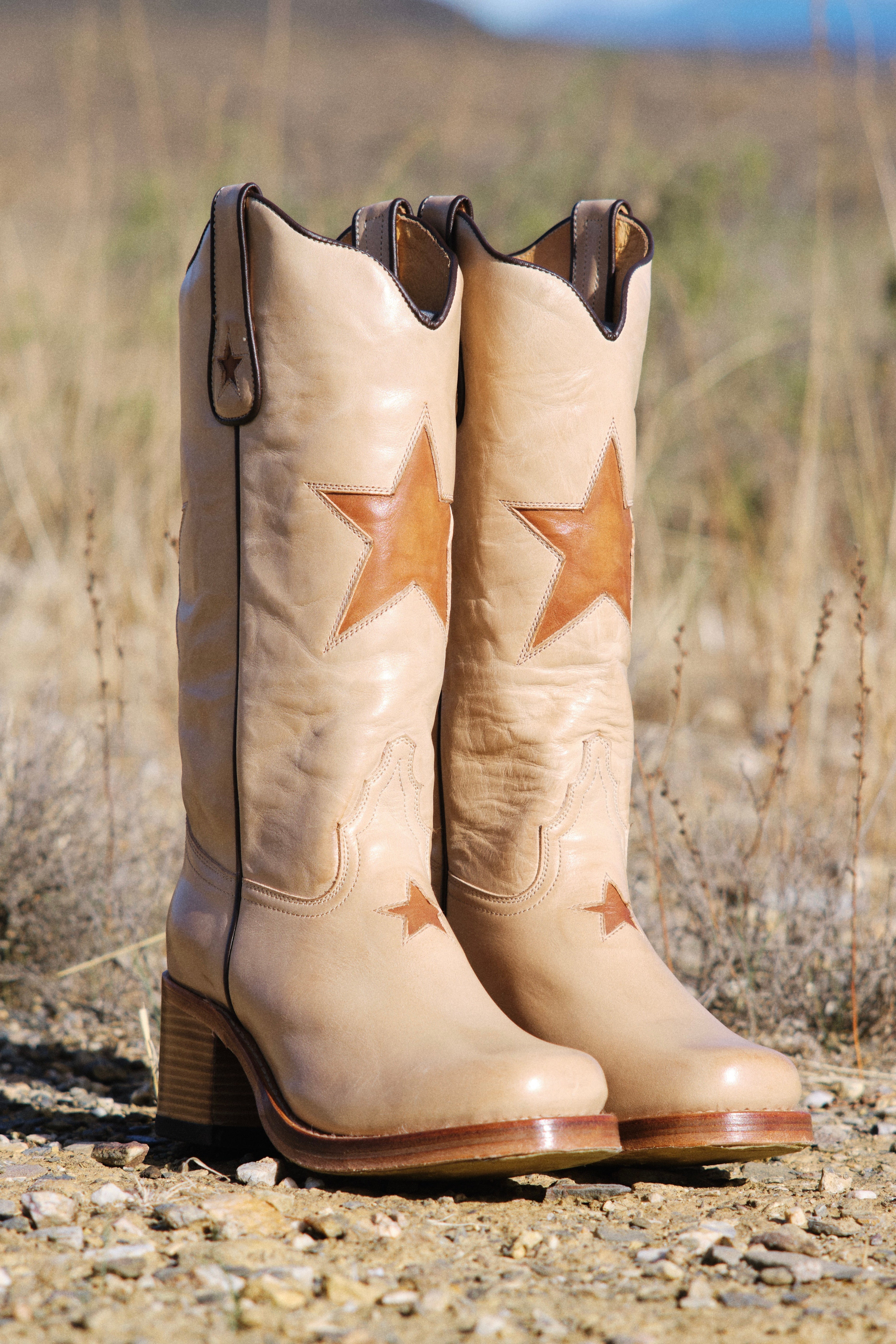 Met de hand gemaakt van premium Spaans volnerf leer. De boterzachte bone tint combineert moeiteloos met herfstneutraal, denim en prairie rokken. Op de schacht en voorzijde zit een donkerblauwe ster inlay voor speelse charme. Een knipoog naar vintage Americana, festival styling en een vleugje kosmische magie. Treklussen en een elegant gebogen schacht zetten het klassieke cowgirl silhouet neer. De rustige bone kleur houdt het veelzijdig, het hele jaar door.