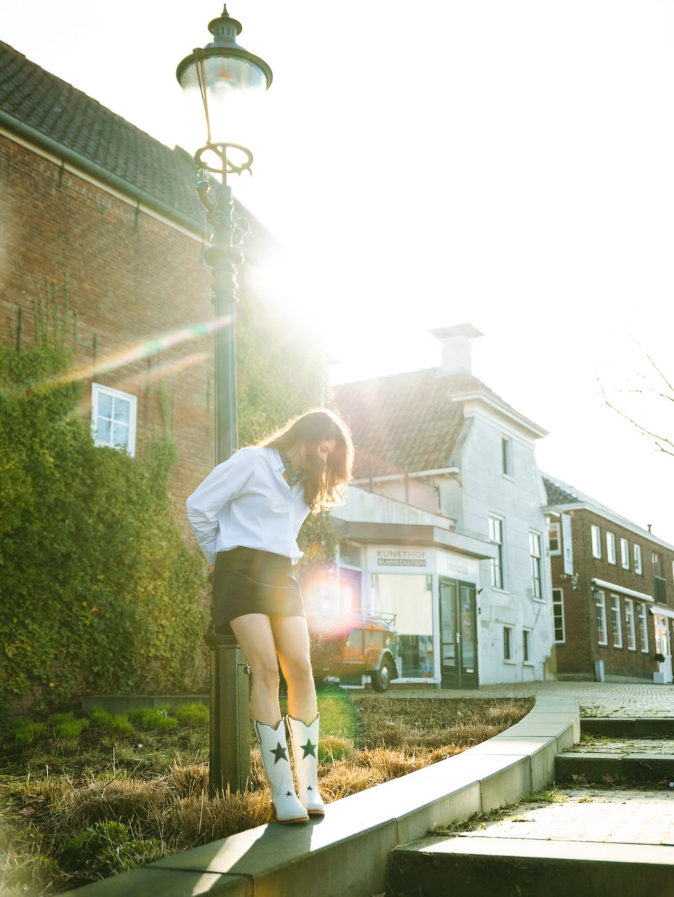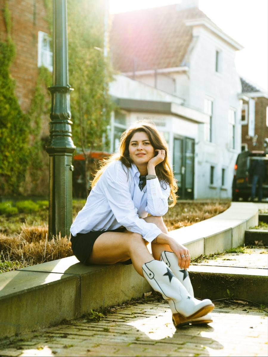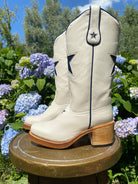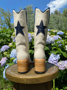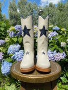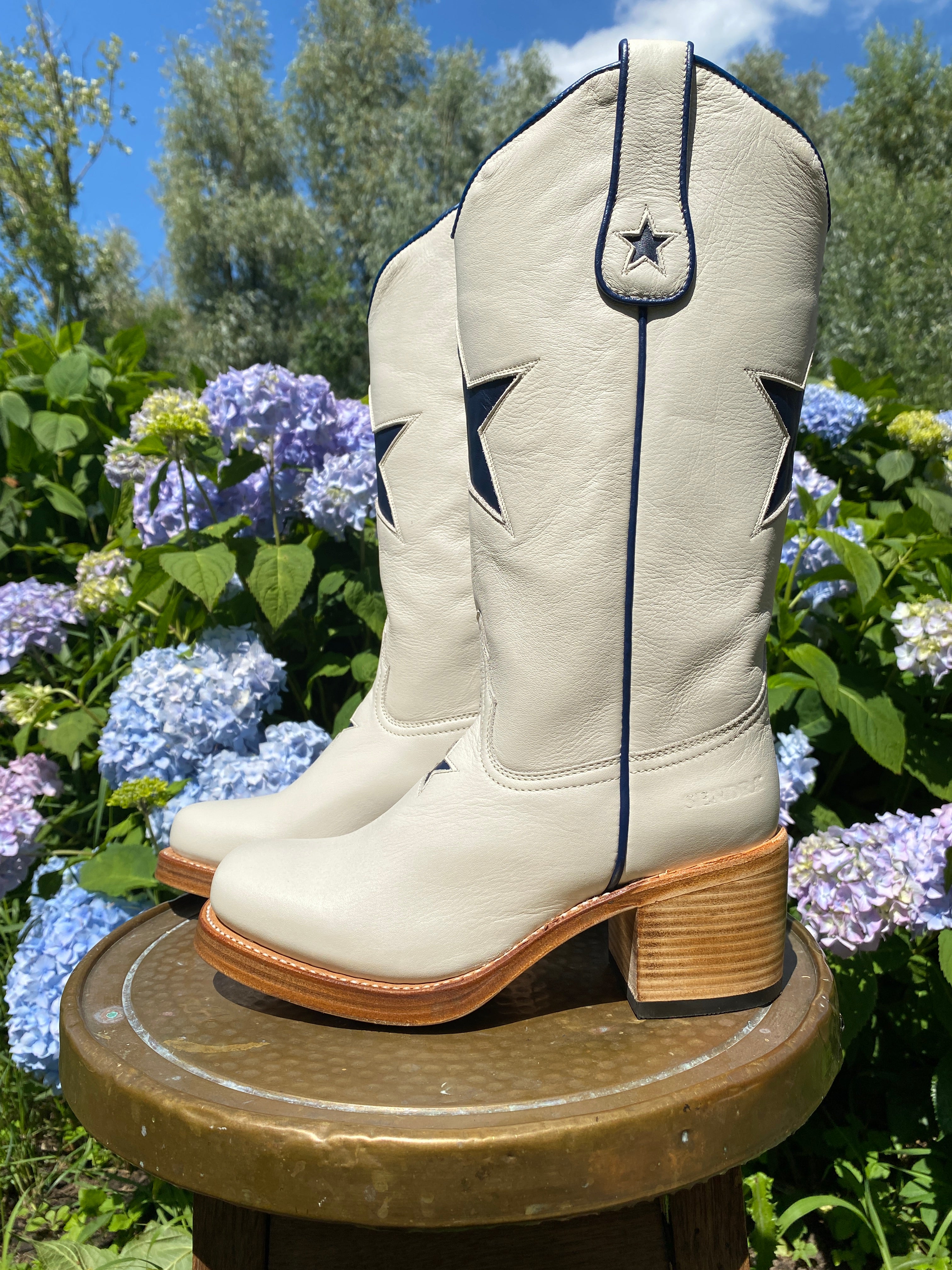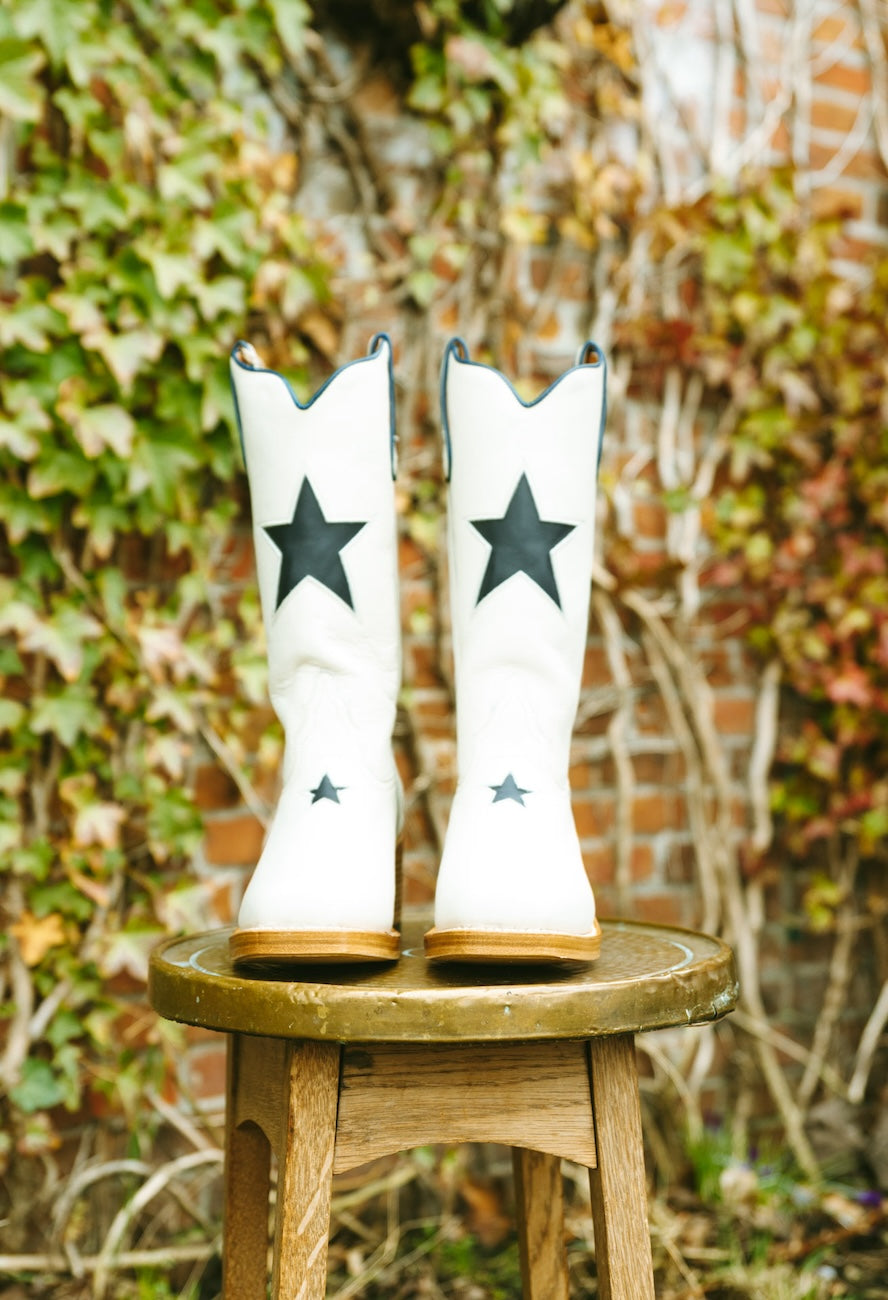 Met de hand gemaakt van premium Spaans volnerf leer. De boterzachte bone tint combineert moeiteloos met herfstneutraal, denim en prairie rokken. Op de schacht en voorzijde zit een donkerblauwe ster inlay voor speelse charme. Een knipoog naar vintage Americana, festival styling en een vleugje kosmische magie. Treklussen en een elegant gebogen schacht zetten het klassieke cowgirl silhouet neer. De rustige bone kleur houdt het veelzijdig, het hele jaar door.