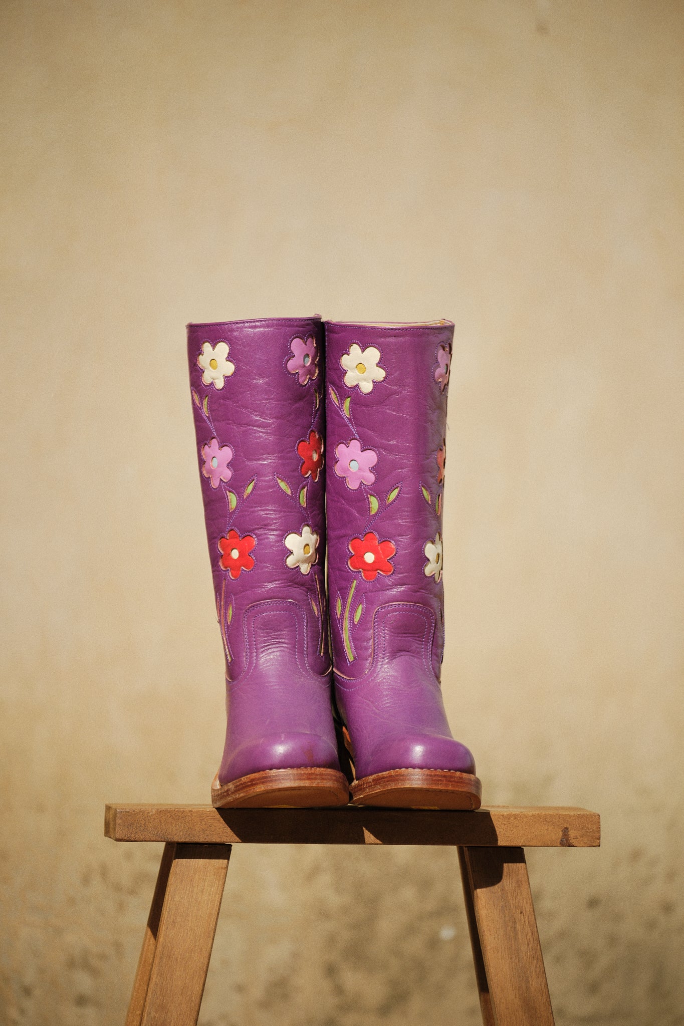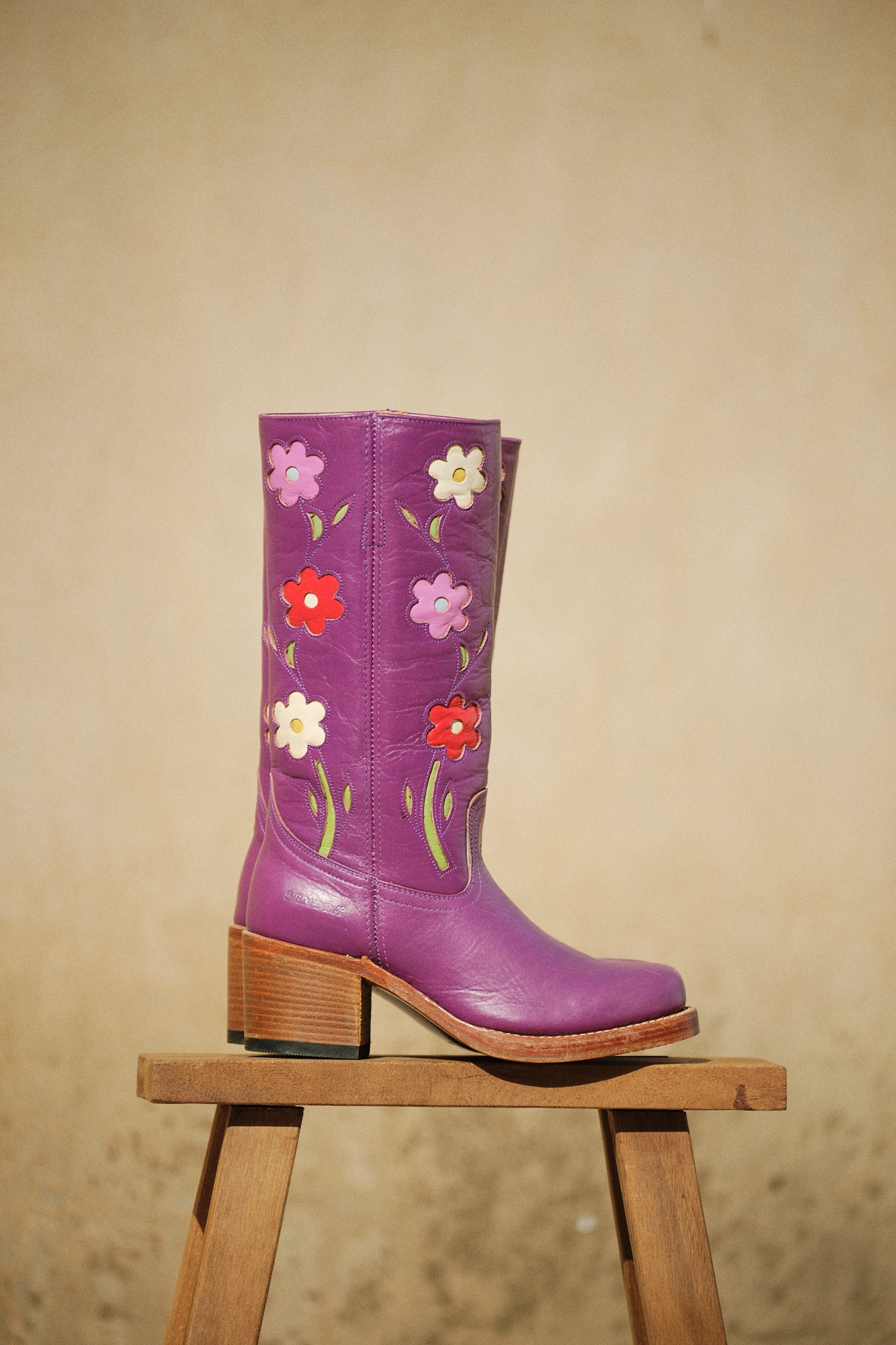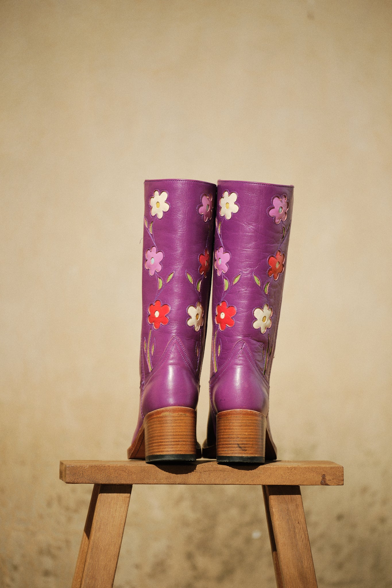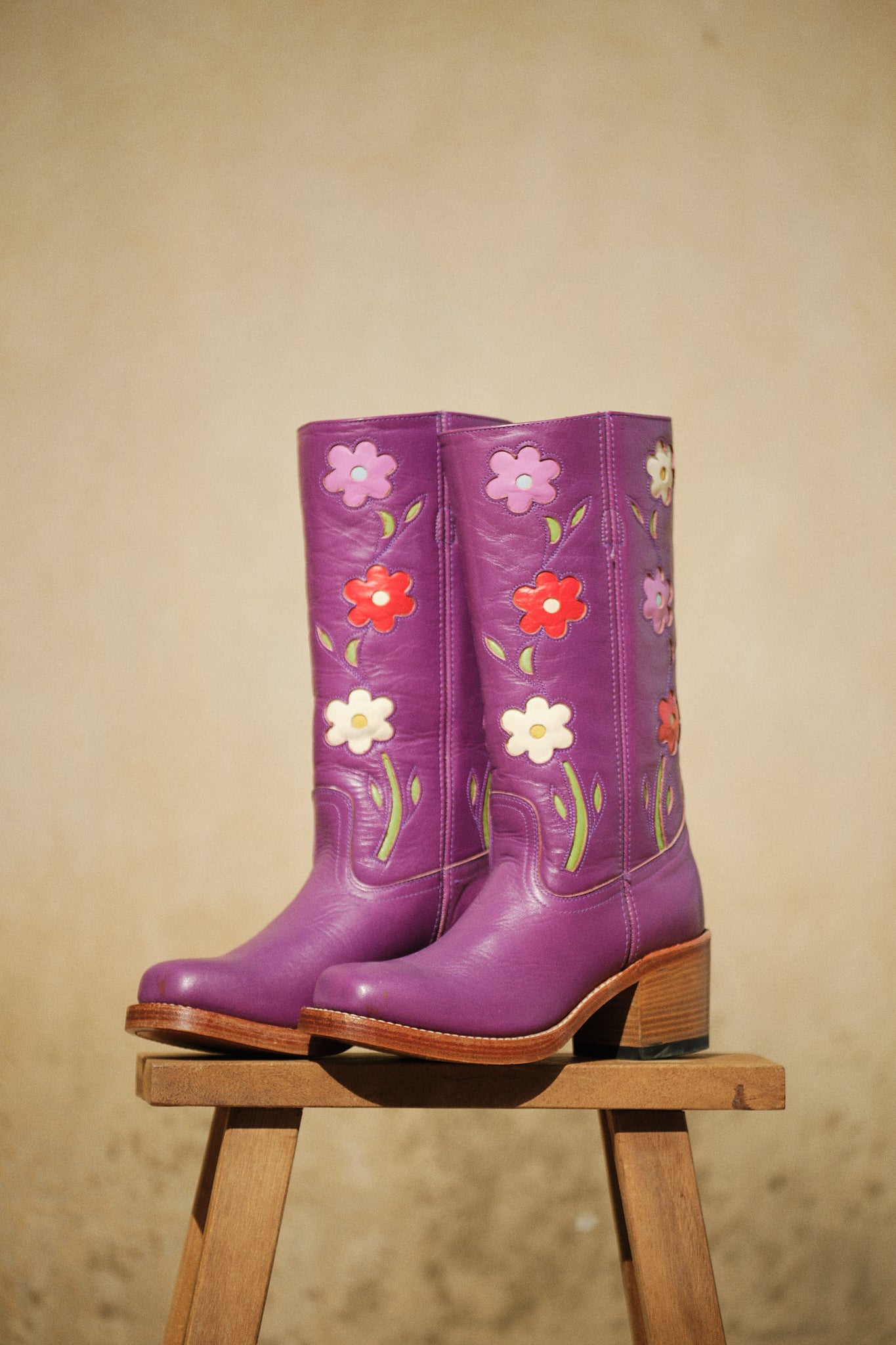 Statement, maar dan wel schattig. Kenmerkende Dandelie-bloemen op helder, verzadigd paars leer. De pasvorm is comfortabel en de afwerking is van top tot teen premium. Dit is een deadstock-item en er is slechts één paar beschikbaar.