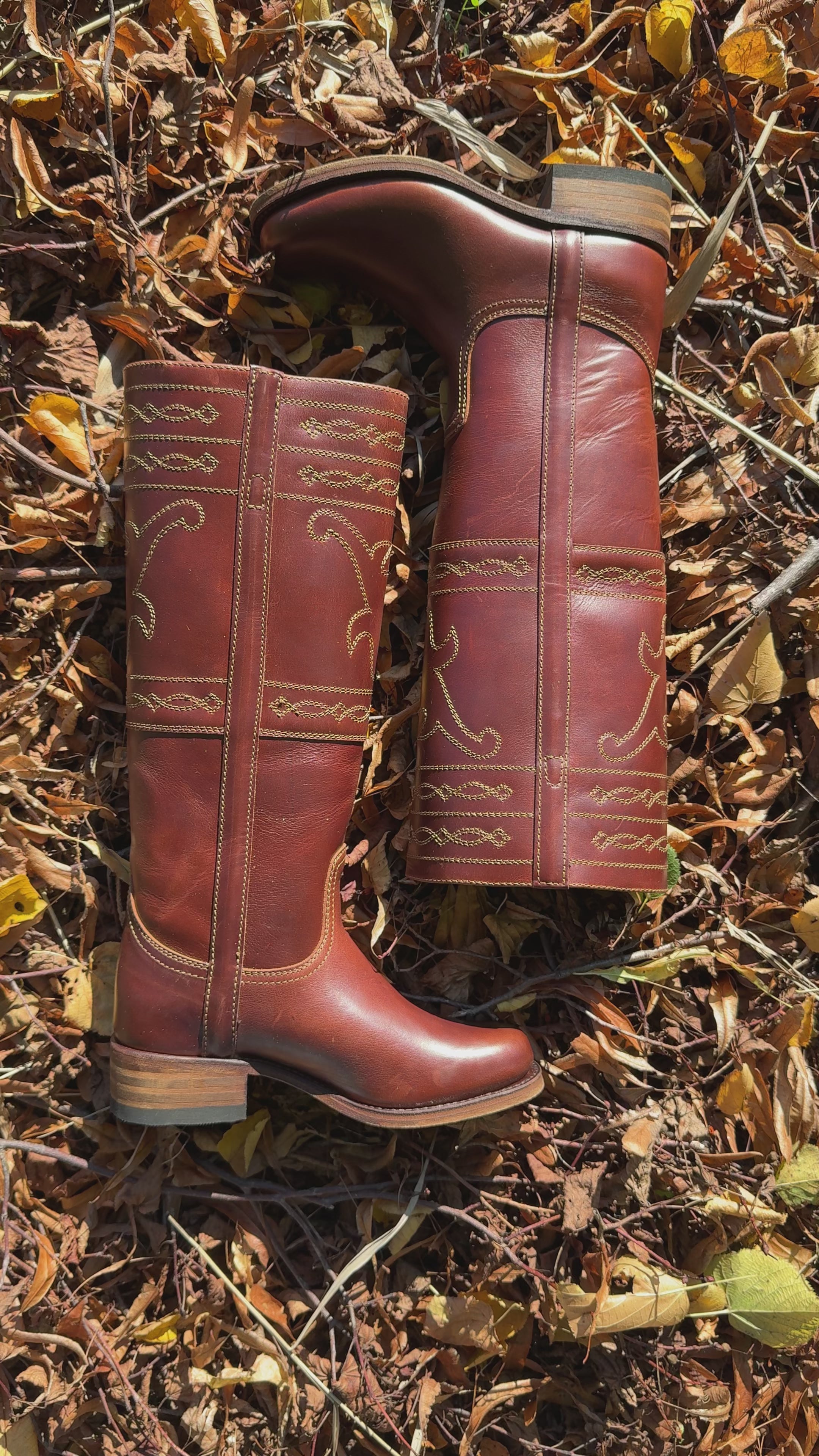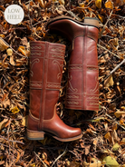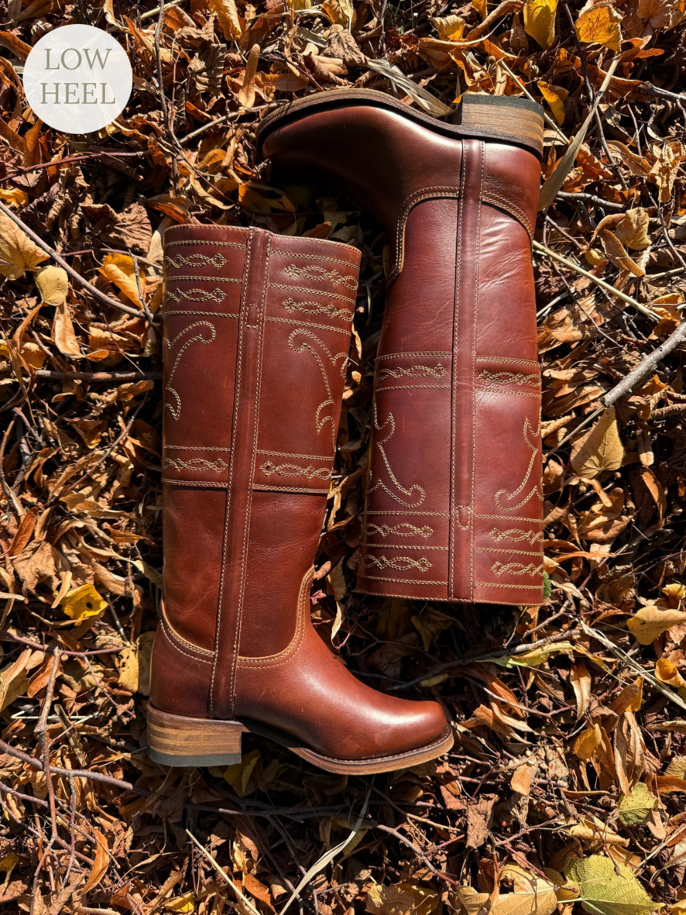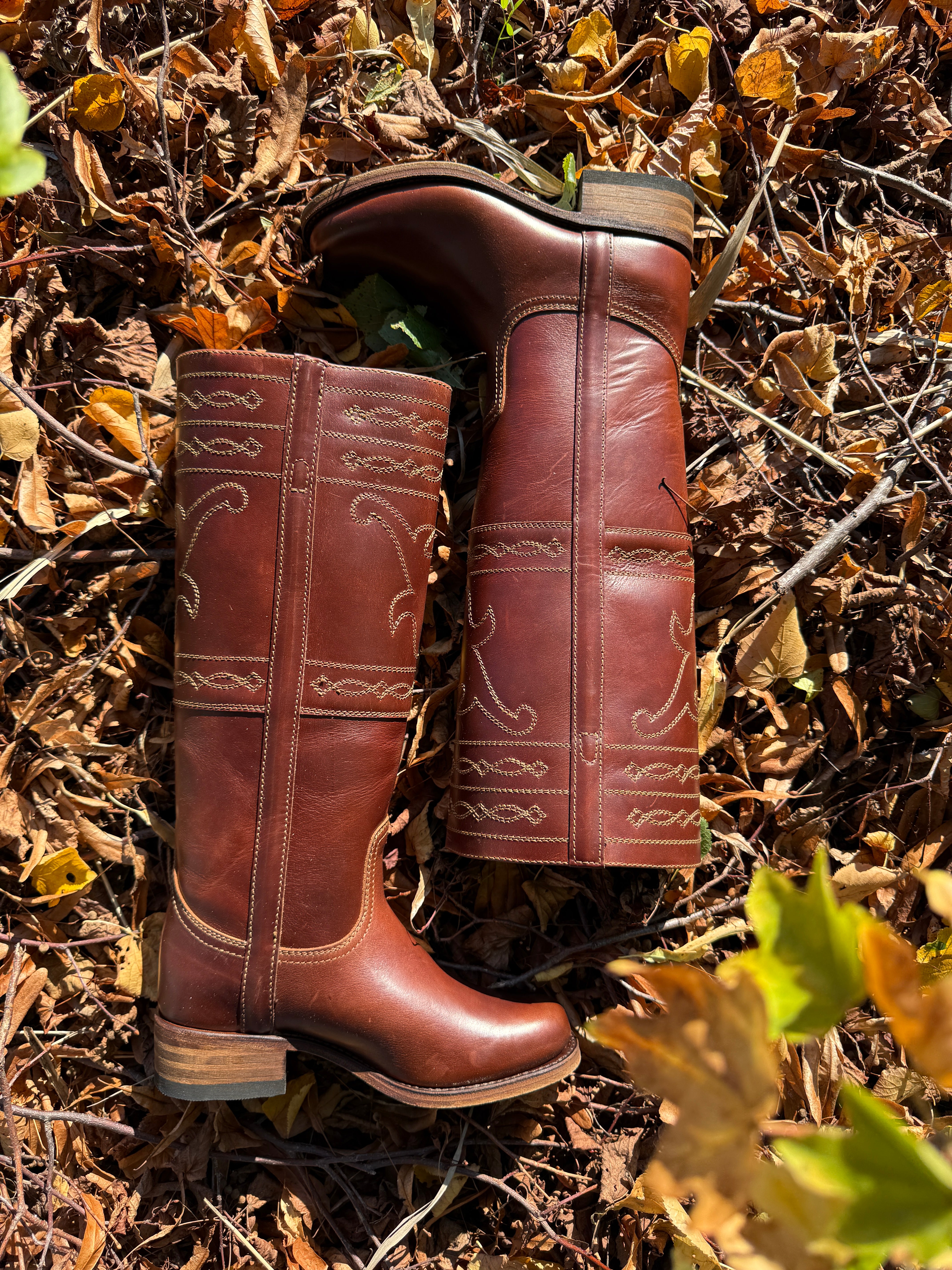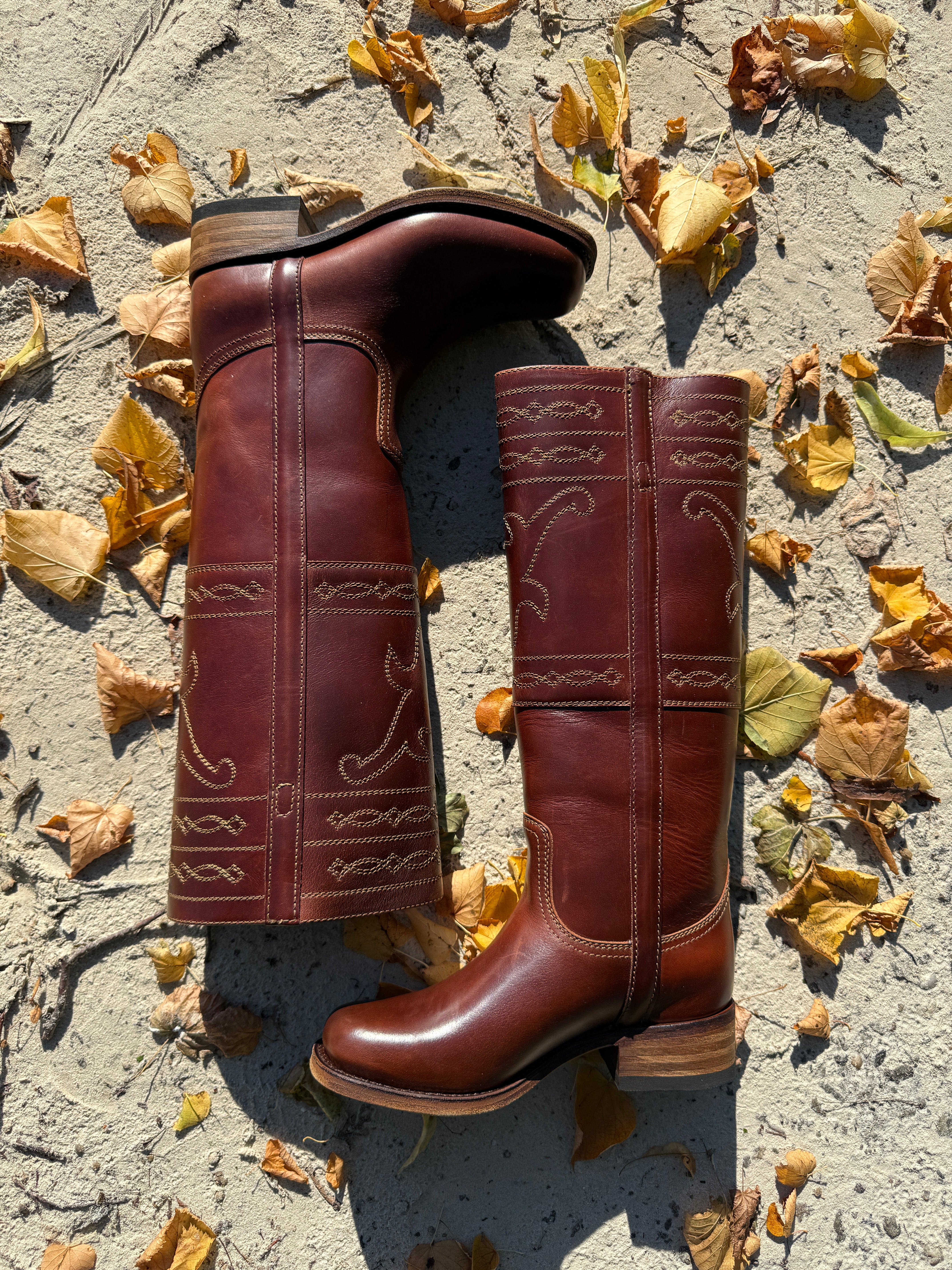 Maak kennis met Dandelie's Stitching Taurus Boots in kastanje – gedurfd, gestructureerd en prachtig klassiek. Deze opvallende kniehoge leren laarzen voor dames zijn een ode aan de klassieke western spirit met een vrouwelijke twist. Gemaakt van soepel volnerfleer in een warme, zonovergoten kastanjekleur, geven ze elke look direct karakter en een zelfverzekerde uitstraling.